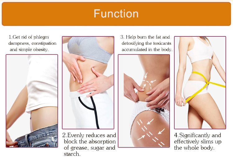 Function The slim patch can get rid of phlegm dampness, constipation and simple obesity. Evenly reduces and block the absorption of grease, sugar and starch.